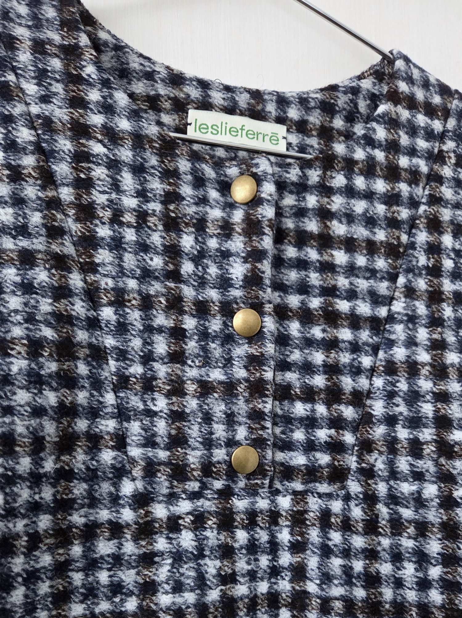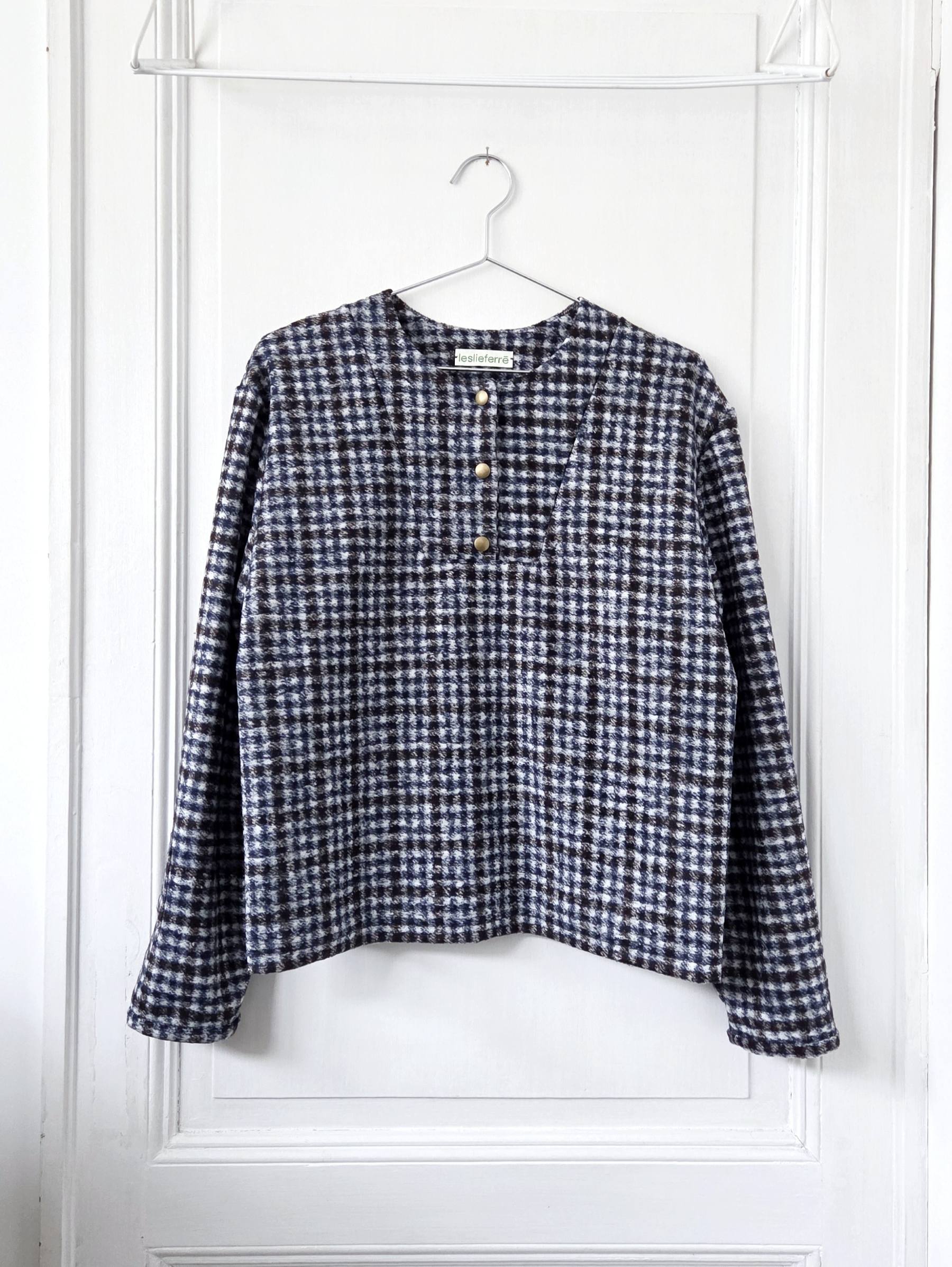 Blouse à carreaux bleus, blancs et marron . La coupe est oversize avec une emmanchure décalée. Le top se ferme au niveau du col grâce à des boutons pressions.