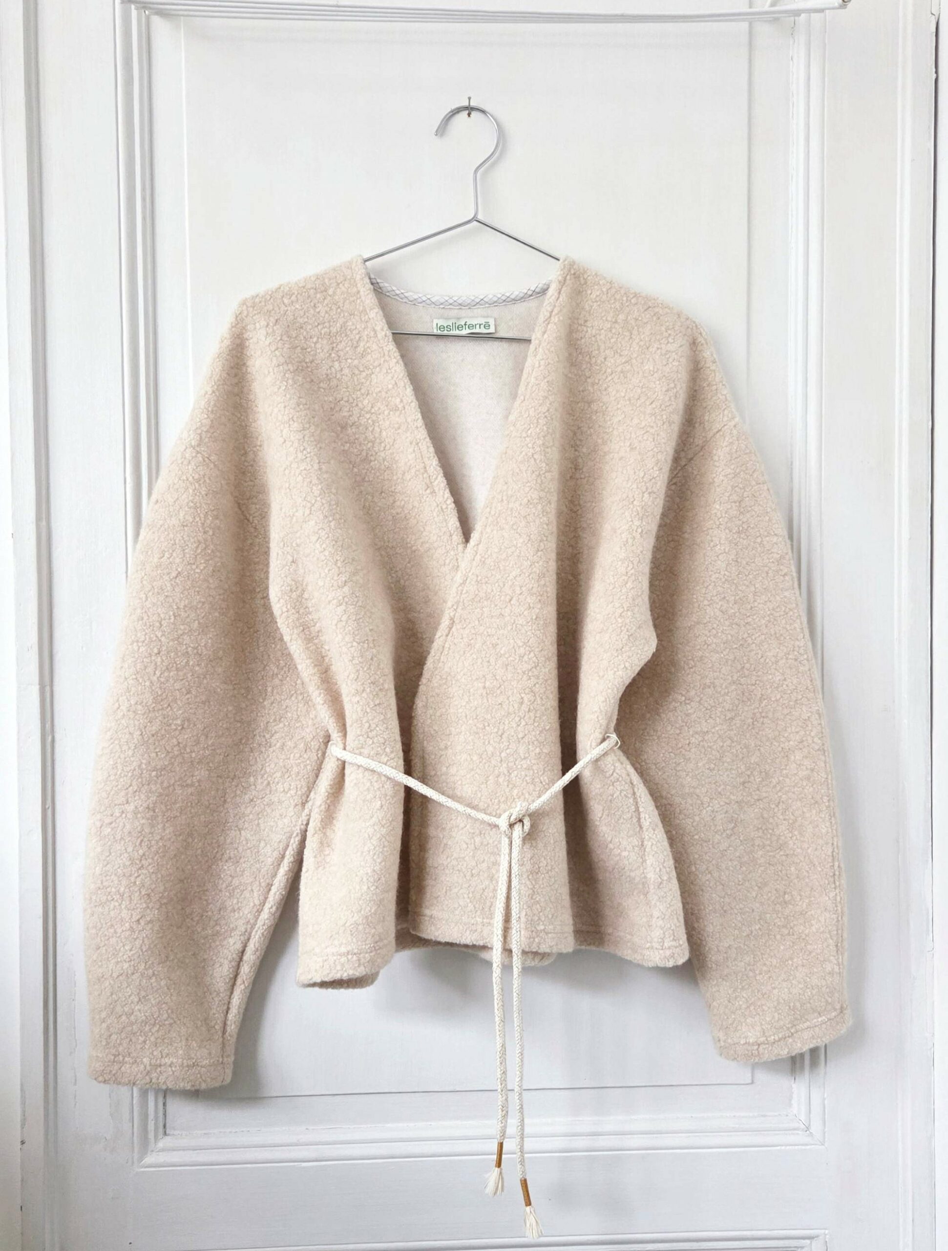 Kimono/Gilet coupe oversize et emmanchure décalée. Les manches sont amples et arrondies, elles sont resserrées dans la bas afin de créer un joli mouvement et un joli tombé. Il est chaud et léger, très confortable à porter.