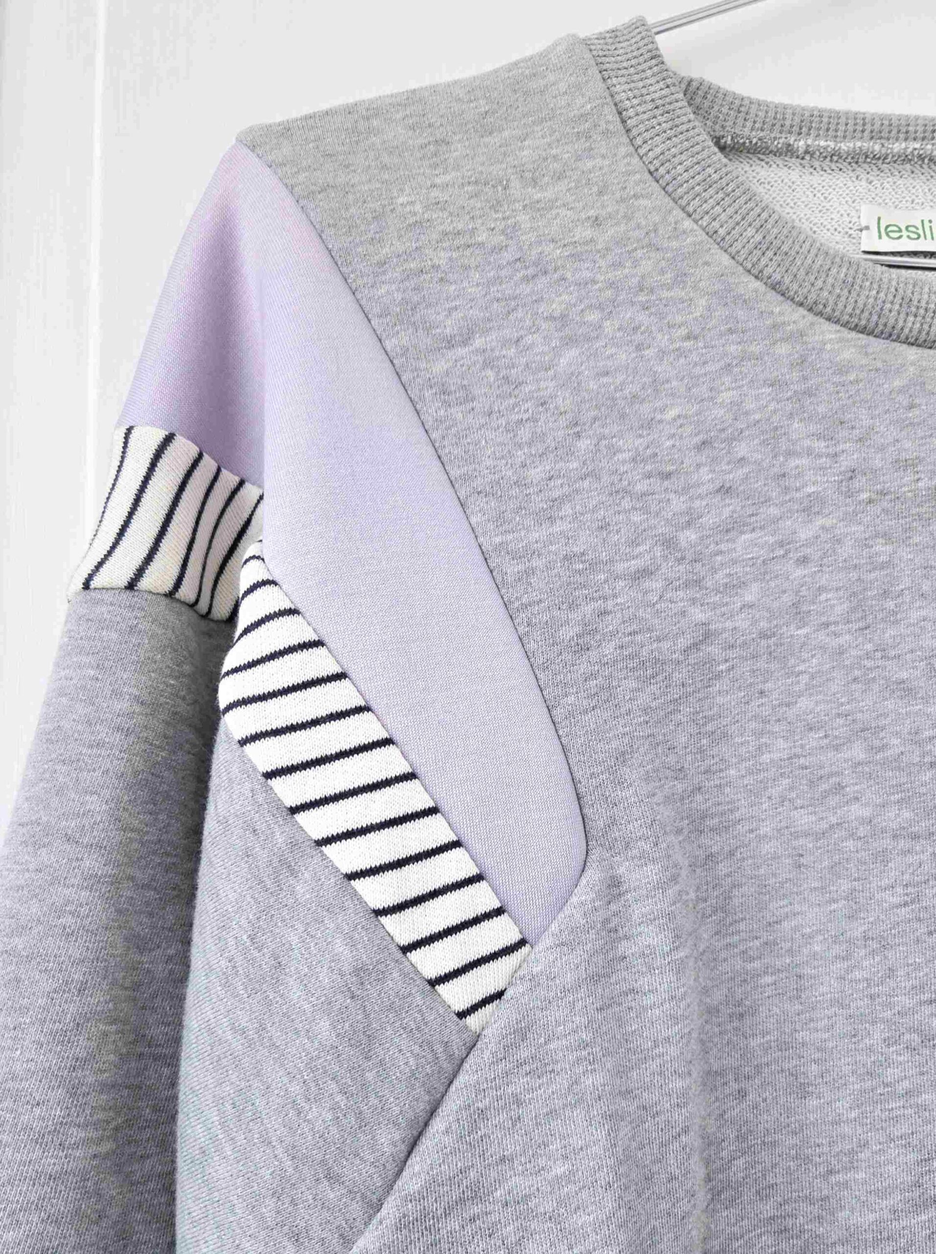 C’est une taille unique qui conviendra au 36, 38 et petit 40.La matière provient des stocks dormants d’une maison de couture de luxe Française.C’est un Jersey sweatshirt gris chiné en 100% coton.