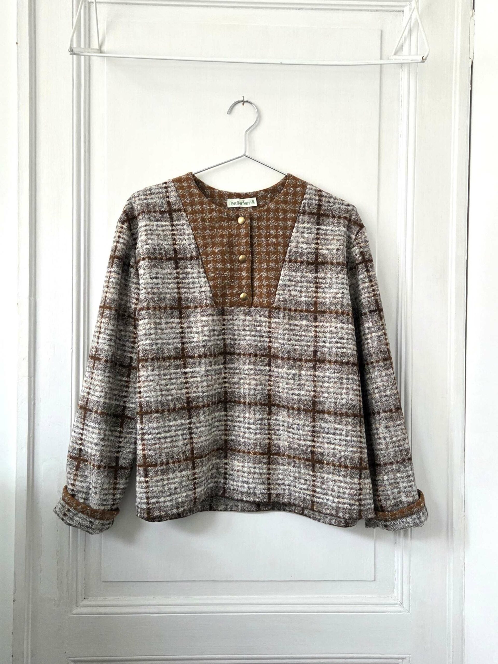 Blouse à carreaux de couleur grise, blanc cassé et caramel. La coupe est oversize avec une emmanchure décalée. Le top se ferme au niveau du col grâce à des boutons pressions.