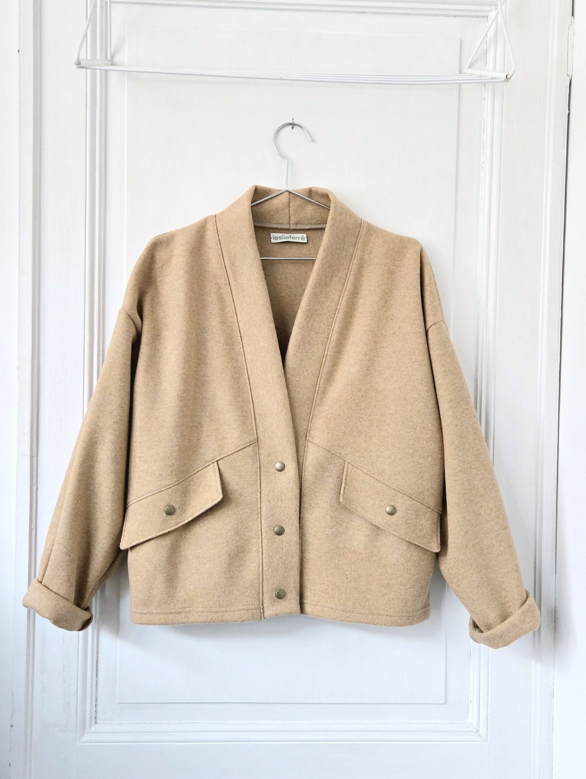 Veste Cardigan Camel en maille, fabriqué par mes soins, en très petite série, à Bruxelles.